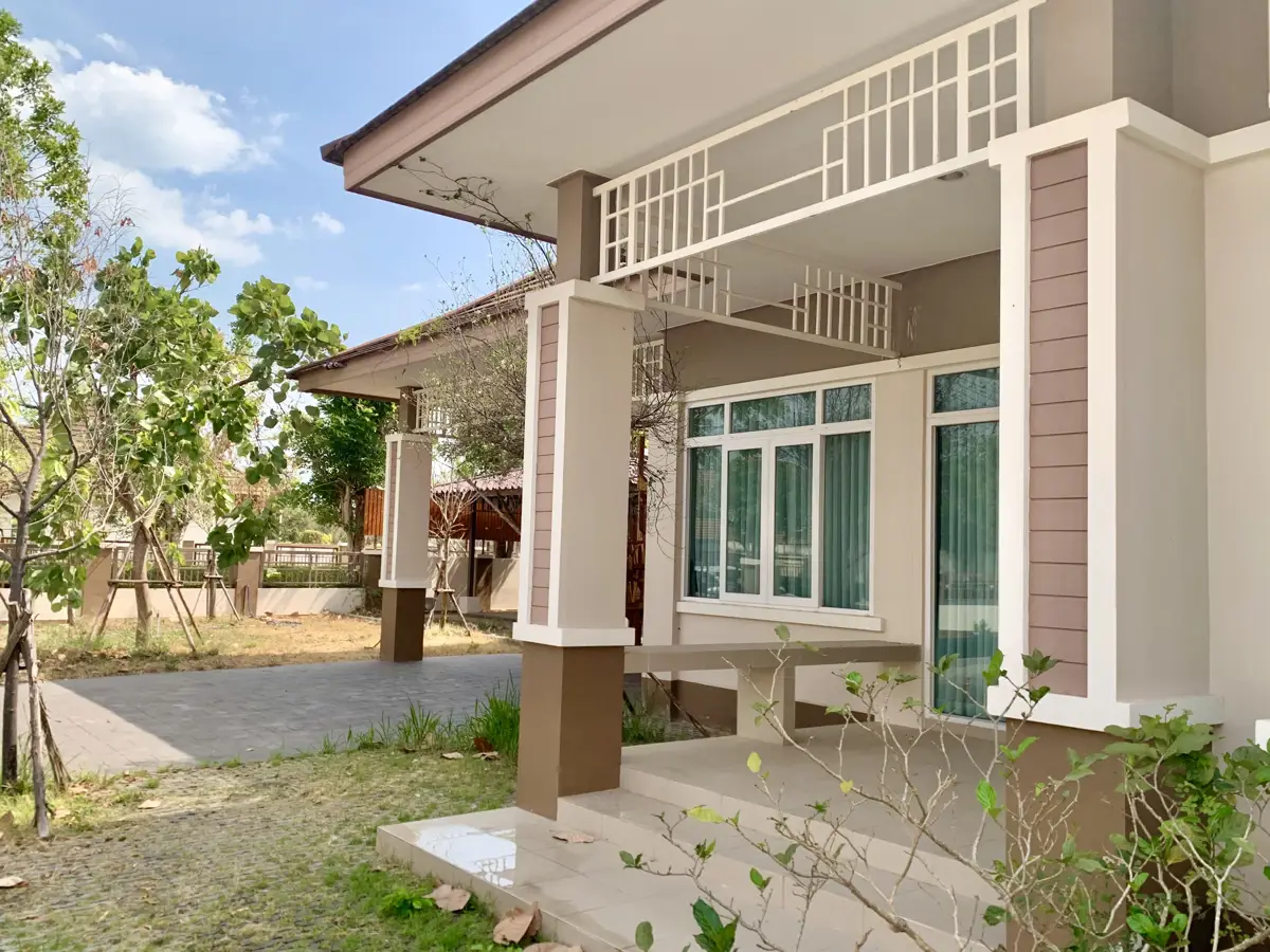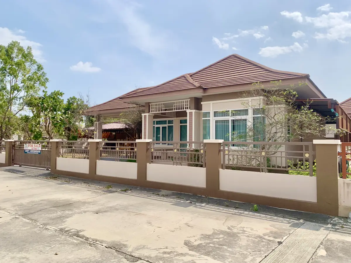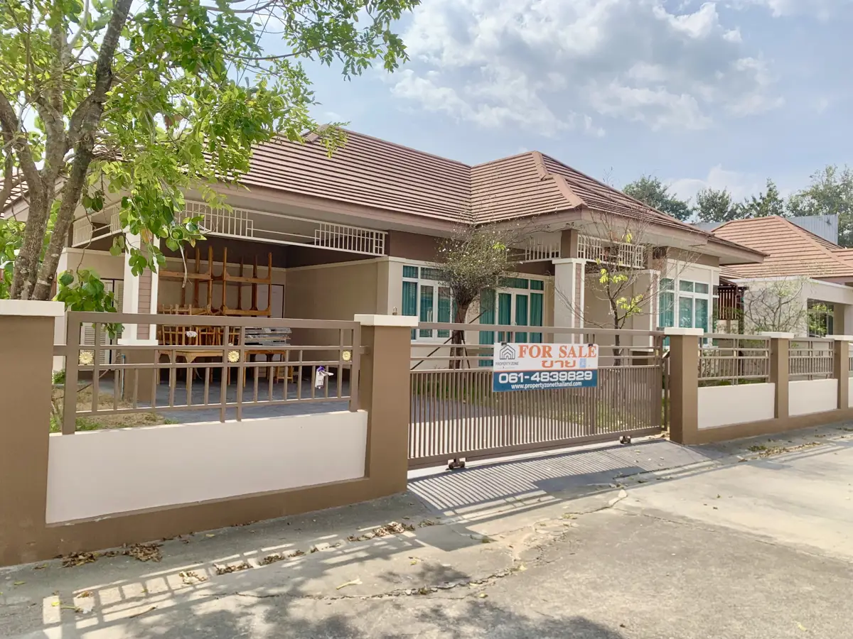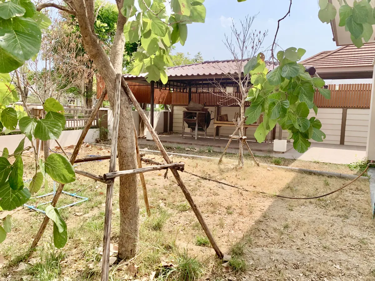 The well maintained and lovely home has never been lived in and is on one of the larger corner lots at The Palm Phala Beach gated community in Ban Chang. It is being offered with large indoor kitchen and also outdoor Thai kitchen area ready. It boasts a large outdoor patio area with a gazebo which is perfect for meals and entertaining, and several mature trees. There are also additional covered areas which were are upgrades, and covered parking for 2 cars. Large size TVs are all included and never been used, and some furniture. There are also very convenient floor to ceiling cupboards in the bedrooms. It is ideally located within steps to the community swimming pool and gym. For those who do not know, The Palm is a well sought after gated community in Ban Chang as it is close to the beaches, convenience stores, Tesco Lotus, DIY, car wash, many restaurants on Phala road, a 711 in the village, near UTP Airport, and also only a few minutes drive to Garden International private school (GIS) and Rayong English Program school (REPS). It is recognizable by its grand enrtrance. The quiet gated community has 24/7 manned security with night patrol, a friendly family oriented atmosphere, and has one of the largest swimming pools in Ban Chang and also a small gym. This property was originally purchased from the developer at the same price as asking price now including numerous upgrades. Buyers who are familiar with the area will know that this property has tremendous value. Reminder, the house has never been lived in and is in pristine condition.